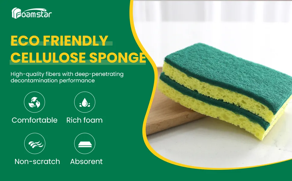 double sided:High-density sponge:Strong absorbent foaming rich, Flexible scouring pad:Effectively removes stubborn stains