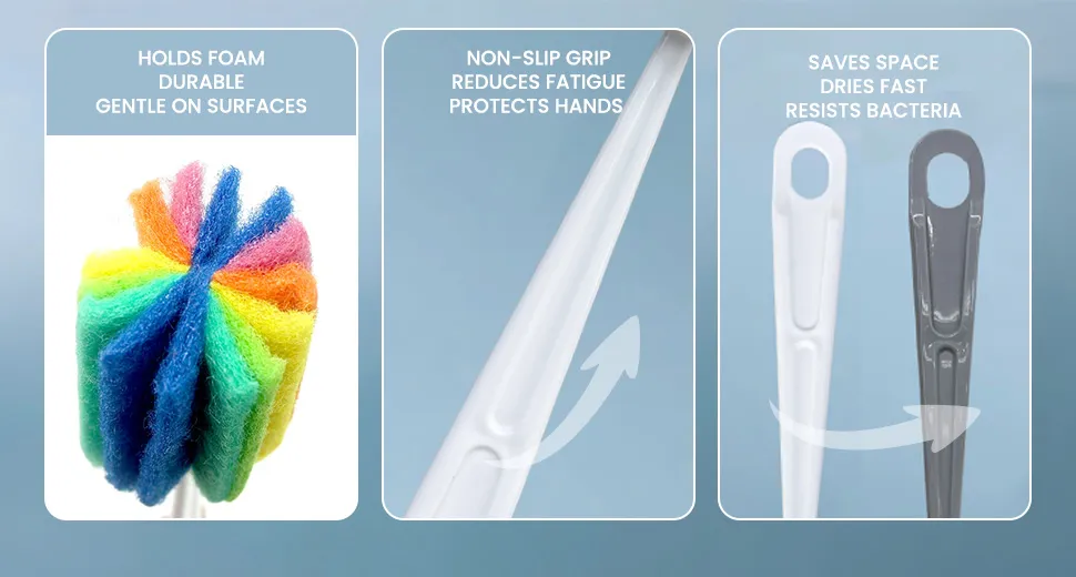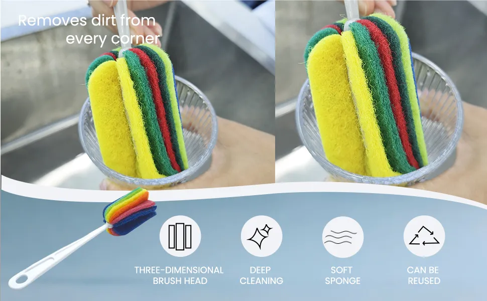 Deep 360° Cleaning-Extended plastic handle + flexible sponge head reaches deep into cups/bottles, removing stubborn stains in corners.
