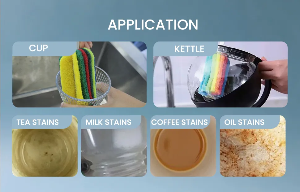 Feature: Colorful scouring pad brush head, Strong Stain-Removing Power,Durable & Long-Lasting, Multi-Purpose